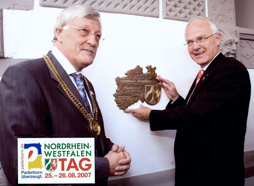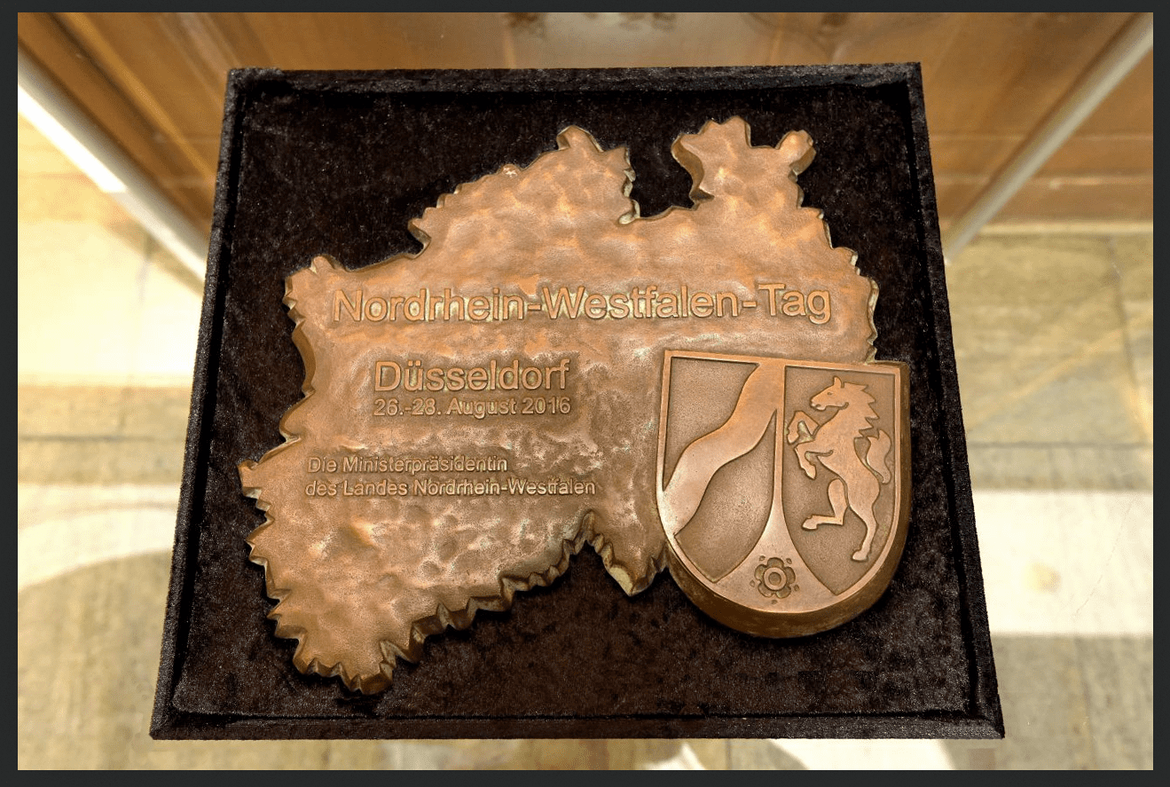 Der/die NRW-Ministerpräsident/in übergibt anläßlich des NRW-Tages jedes Jahr die Bronzeplakette persönlich an den Bürgermeister der jeweiligen Gastgeberstadt.