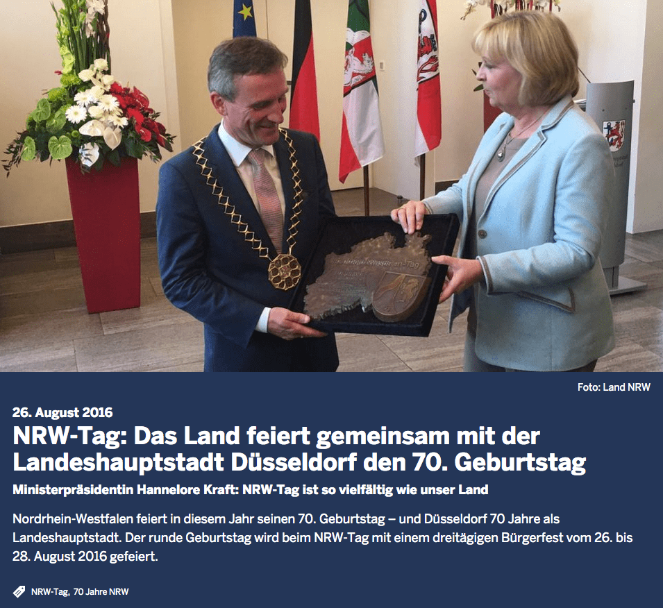 Auch zum 70. Geburtstag Nordrhein-Westfalens und anläßlich 70 Jahre Landeshauptstadt Düsseldorf überreichte die Ministerpräsidentin Hannelore Kraft dem Düsseldorfer Oberbürgermeister Thomas Geisel im Rathaus die NRW-Plakette.