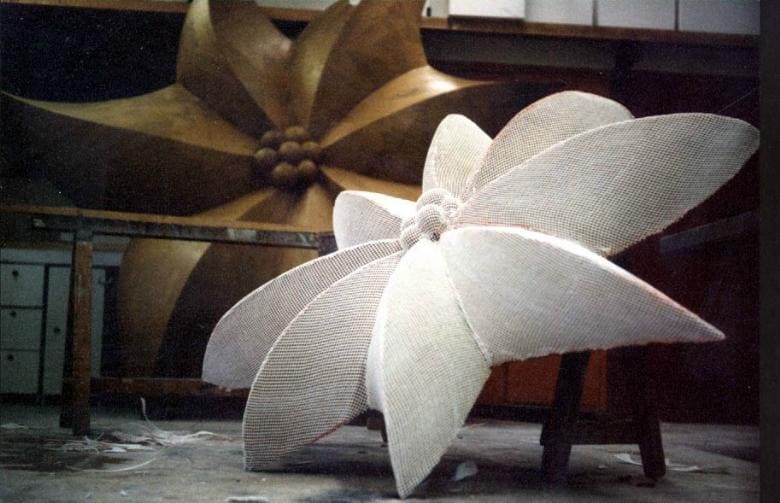 3D-Objekte für Theater Die Bühnendekoration besteht aus einem Kunststoffgitter welches die Riesenblumen transparent erscheinen läßt.Die Größte der Dekoblumen hat ein Durchmesser von 2 m.