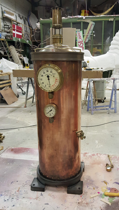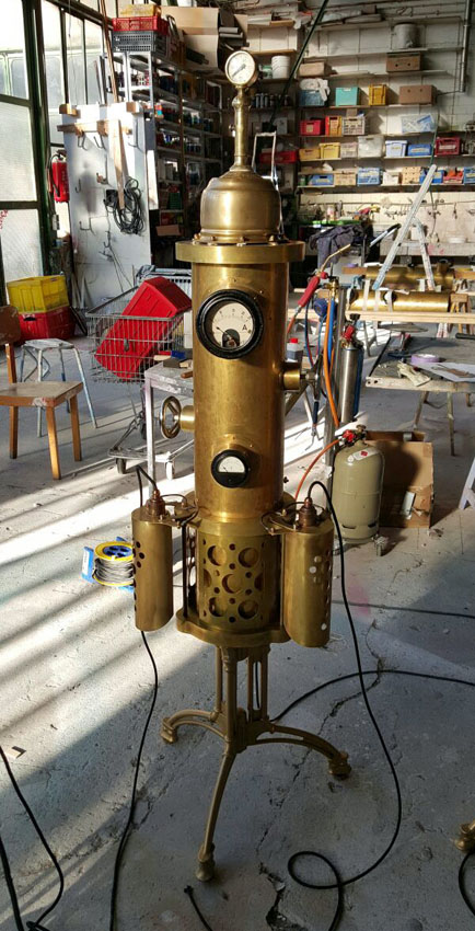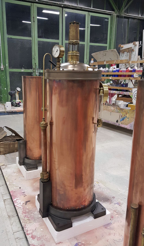 Der Kunde beauftragte uns für den Bau von drei großen, kupferfarbenen und fünf schmaleren, messingfarbenen Dampkesseln.