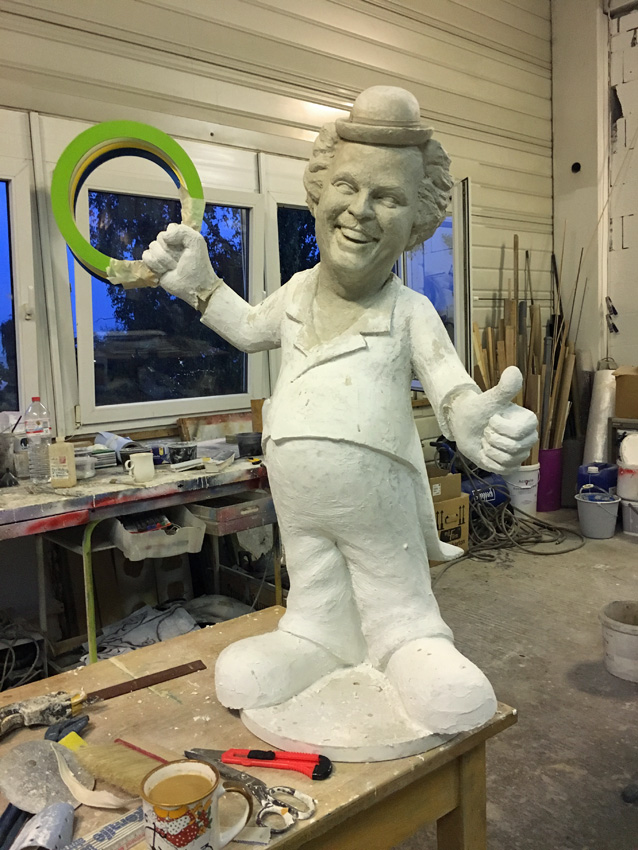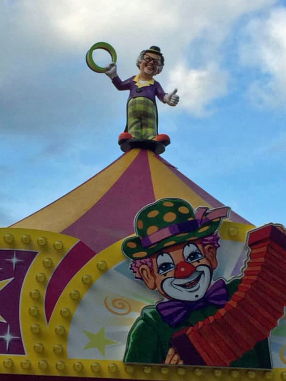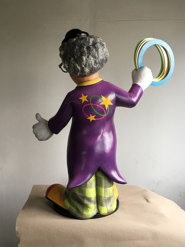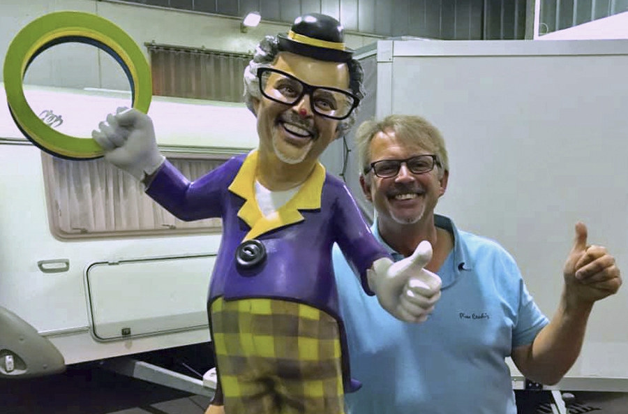 Skulptur eines Clowns für eine Ringwurf Rummel-Attraktion mit Porträt des Inhabers Torsten Golbach.