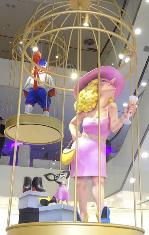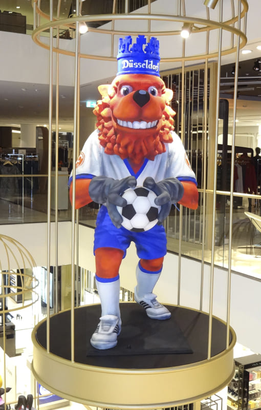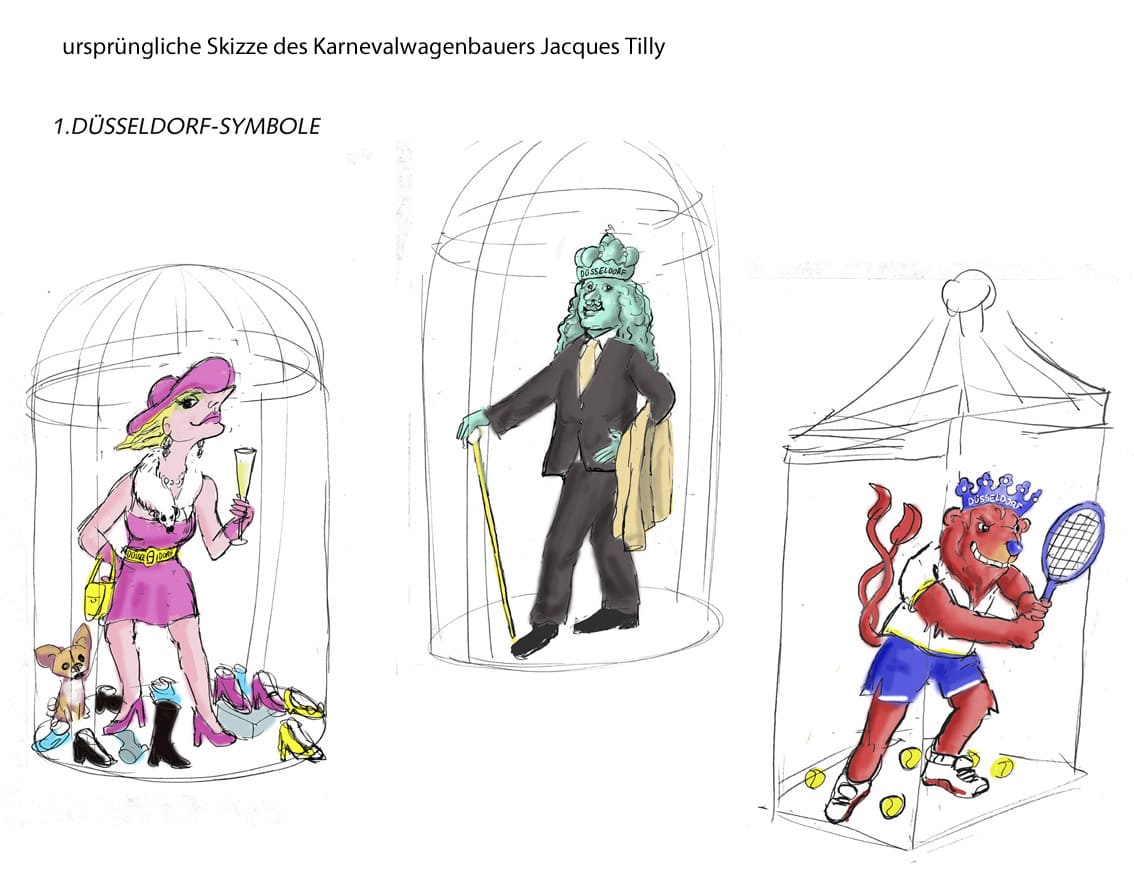 Die drei Werbefiguren wurden in Käfigen im Treppenhaus des Gebäudes platziert. In Form von Großplastiken werden humoristisch-satirisch gestaltete Düsseldorf-Allegorien dargestellt: Die Kö-Tussi als Symbol für das Schicki-Micky-Image von Düsseldorf, der Düsseldorfer Löwe als Fortuna-Sportler und der Düsseldorfer Barock-Fürst Jan Wellem in modernem Anzug.